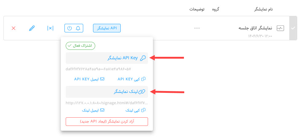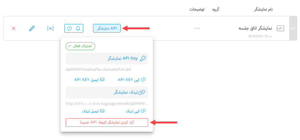 با حذف یک نمایشگر، api تولید شده برای آن، برای همیشه حذف میگردد. به همین دلیل لینک api و یا api key در سیستمی که از این api استفاده مینموده باید دوباره تعریف گردد.