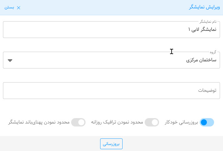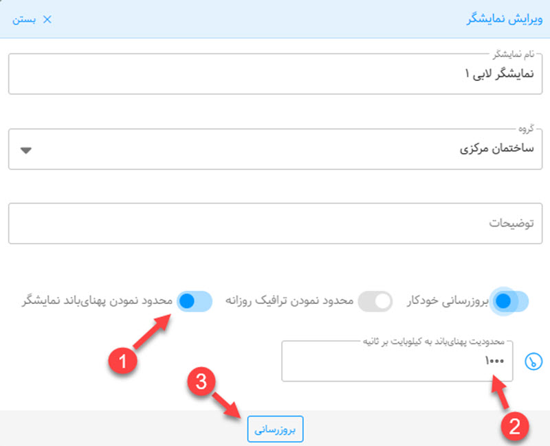 در پنل ویرایش نمایشگر، علاوه بر ویرایش نمایشگر میتوان محدودیت ترافیک، زمانهای بروزرسانی، محدودیت پهنای باند نمایشگر را نیز ثبت و یا تغییر داد.