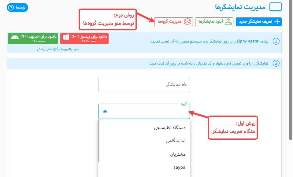 امکان اضافه شدن نمایشگر به سامانه از طریق Elphy Agent نیز وجود دارد. برای این منظور به راهاندازی نمایشگرهای ساینیج مراجعه نمایید.