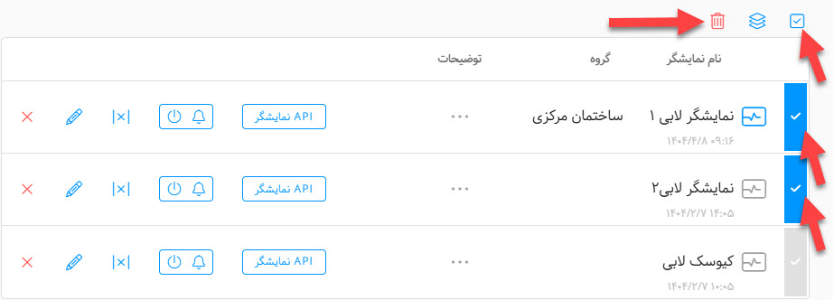 برای حذف و یا تغییر گروه چندین نمایشگر میتوان آنها را انتخاب کرده و از طریق گزینههای بالای جدول نمایشگرها آنها را حذف کرده و یا گروه آنها را تغییر داد.