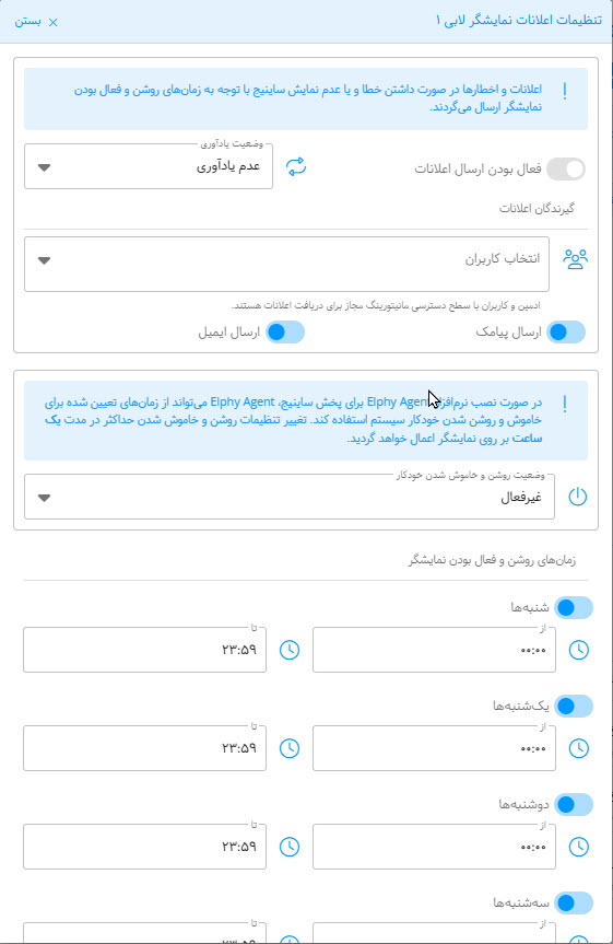 در پنل اعلانات زمانهایی که باید ساینیج بر روی نمایشگر فعال باشد و همچنین کاربرانی که برای آنها ایمیل و یا پیام کوتاههای اخطارهای احتمالی باید ارسال گردد انتخاب شود.