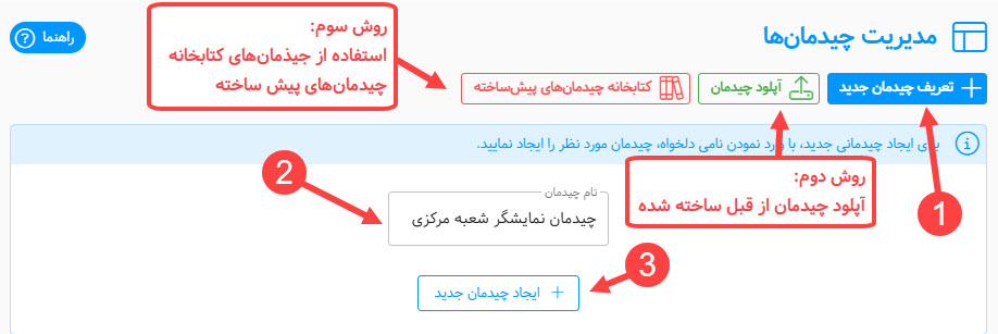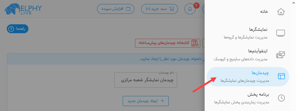 برای ایجاد چیدمان جدید، در پنل کاربری در بخش چیدمانها، چیدمان مورد نظر را با نام دلخواه میتوان ایجاد نمود. سعی شود که نام چیدمانها متناسب با محتوا و یا کاربرد انتخاب شود. در صفحهی زمانبندی، چیدمان با این نام شناخته خواهد شد.