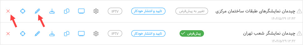با مراجعه به پنل چیدمانها، در قسمت لیست چیدمانها از طریق دکمههای مربوطه نام هر چیدمان را میتوان ویرایش و یا آن را حذف نمود.