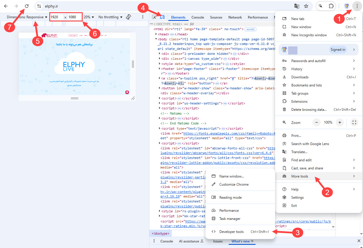 ۲- با استفاده از دکمه F12 یا از منو اصلی مرورگر، developer tools مرورگر را باز کنید.