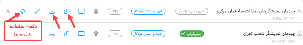 توسط دکمه کپی چیدمان در لیست چیدمانها میتوان از چیدمانی که قبلاً تهیه شده است نسخهی جدیدی ایجاد نمود. همچنین توسط دکمه دانلود چیدمان میتوان فایل چیدمان طراحی شده را به منظور تهیه نسخه پشتیبان و یا برای ارسال برای اکانت دیگری دانلود نمود. همچنین میتوانید با استفاده از دکمه استفاده کنندهها بررسی کنید چیدمان شما در چه نمایشگرهایی استفاده میشود.