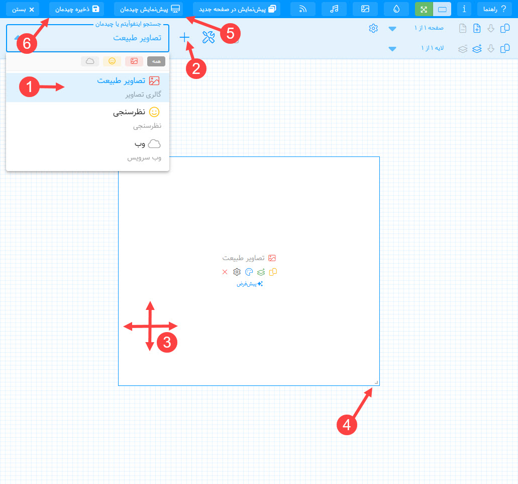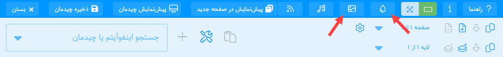 مدیریت لایهها در صفحه (ایجاد، حذف، جابهجا کردن و کپی گرفتن) از طریق منوهای بالای پنل مدیریت چیدمان صورت میگیرد.