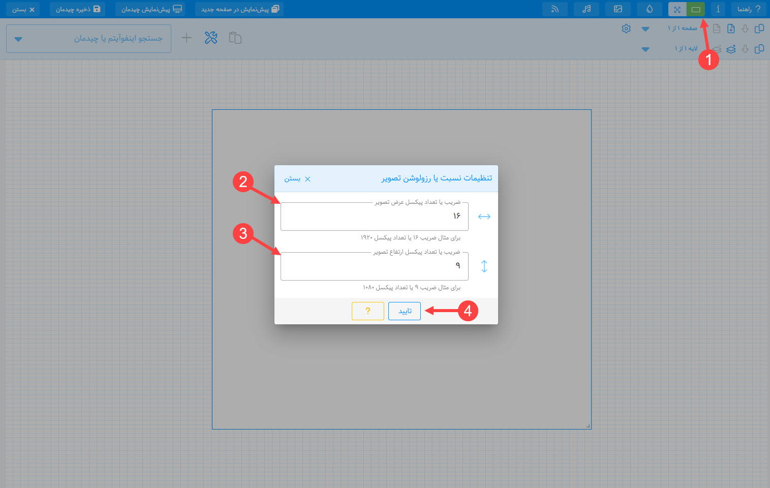 برای اینکه خروجی پیشنمایش را در نسبت تصویر دلخواه مشاهده کرد، از منوهای مربوط به تنظیم نسبت تصویر در نوار بالا پنل مدیریت چیدمان باید استفاده کرد. در پنل باز شده میتوان نسبت طول و عرض نمایشگر و یا رزولوشن آن را وارد نمود.