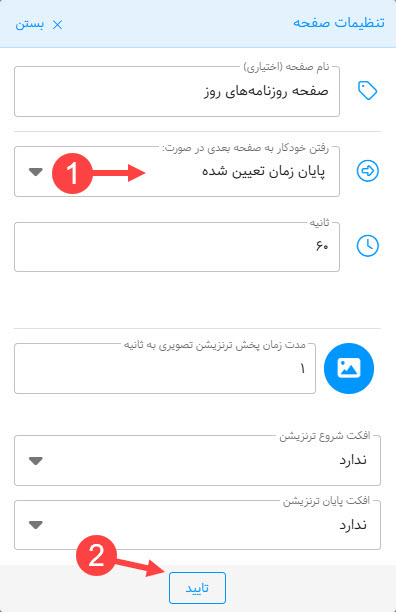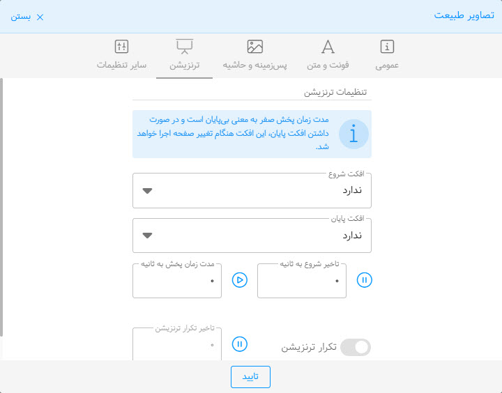در صورت نیاز با فعال کردن سوییچ تکرار ترنزیشن این ورود و خروج اینفوآیتم با فاصله زمانی دلخواه (تاخیر تکرار ترنزیشن) میتواند تکرار گردد.