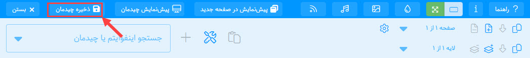 از دکمههای مربوطه در نوار زیرین پنل مدیریت چیدمان میتوان برای ذخیره کردن چیدمان و یا ذخیره و خروج از چیدمان استفاده کرد.