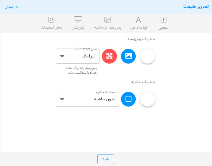 همچنین برای ایجاد افکت پسزمینه بلوری در صورتیکه رنگ پسزمینهای که دارای میزانی شفافیت باشد انتخاب شده باشد، میتوان با تعیین درصد افکت بلور در این صفحه، پسزمینه بلوری ایجاد نمود.