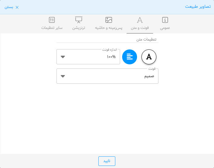 تغییرات مربوط به سایز، رنگ و یا فونت نوشتههای یک اینفوآیتم از طریق این صفحه از تنظیمات صورت میگیرد.