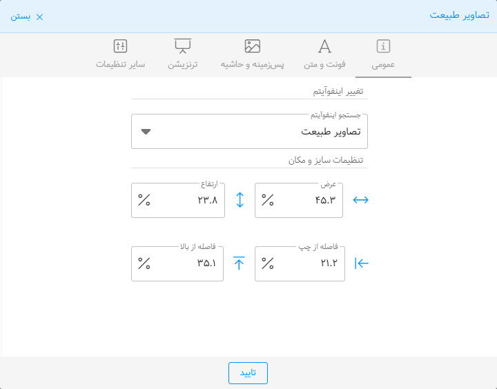 تغییرات مربوط به استایل، نحوه نمایش و عملکرد آیتم در چیدمان از پنل تنطیمات آن آیتم امکانپذیر است. برای وارد شدن به پنل تنظیمات اینفوآیتم از دکمه تنظیمات میتوان استفاده نمود.