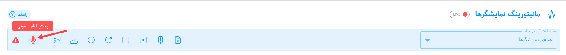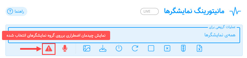 برای انجام دادن عملیاتهای گروهی برای نمایشگرهای پخشکننده ساینیج میتوان از پنل عملیات گروهی در بالای صفحهی مانیتورینگ استفاده نمود.