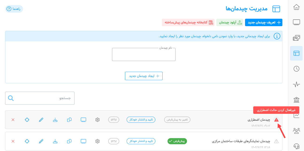۱. ورود به بخش چیدمان به منوی چیدمانها (Layouts) بروید و روی دکمه «فعال کردن حالت اضطراری» کلیک کنید. (این دکمه با آیکون ⚠️ مشخص شده است.)
