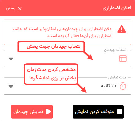 مدتزمان نمایش پیام اضطراری را تنظیم کنید و چیدمان مورد نظر خود را انتخاب کنید.