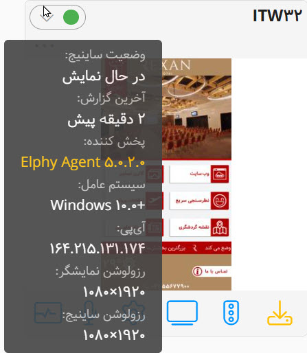 در صورت نصب و آنلاین بودن برنامه Elphy Agent، در لیست مانیتورینگ نمایشگرها، دکمه مربوط به Elphy Agent از خاکستری به سبز تغییر رنگ خواهد داد. برای دسترسی به امکانات ریموت کنترل لازم است بر روی آیکون سبز Elphy Agent کلیک نمود.