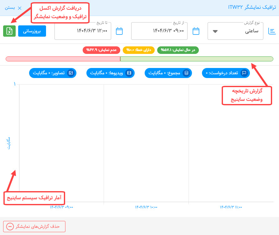 برای دریافت آمار ترافیک مصرفی و یا مشاهده تاریخچه وضعیت نمایش پخش ساینیج از دکمه مربوطه در کارت نمایشگر در پنل مانیتورینگ میتوان استفاده نمود. همچنین برای دریافت آمار گروهی پخشکنندهها از پنل عملیات گروهی در بالای صفحهی مانیتورینگ میتوان کمک گرفت.