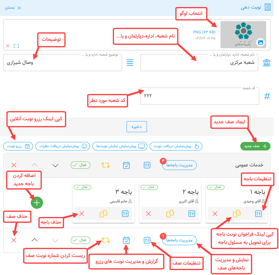 در پنل مدیریت نوبتدهی میتوان به تعداد صفهای موجود در شعبه صف تعریف کرد و همچنین برای هر صف به تعداد باجههای موجود برای آن صف باجه تعریف نمود. بعد از تعریف صفها و باجهها تنظیمات مربوط به هر صف و باجه را توسط منوهای مربوط باید انجام داد.