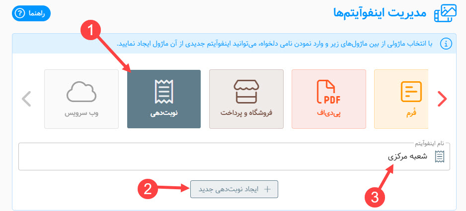 در سامانه برای هر شعبه که نوبتدهی جداگانهای دارد باید یک اینفوآیتم نوبتدهی ایجاد کرد. برای ایجاد اینفوآیتم جدید نوبتدهی در صفحهی اینفوآیتمها با انتخاب اینفوماژول نوبتدهی میتوان آیتم جدیدی ایجاد نمود.