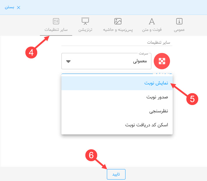 بعد از اضافه نمودن اینفوآیتم نوبتدهی مورد نظر، در پنل تنظیمات آن اینفوآیتم، در صفحهی سایر تنظیمات، نوع نمایش بر روی نمایش نوبت تنظیم و ثبت گردد.