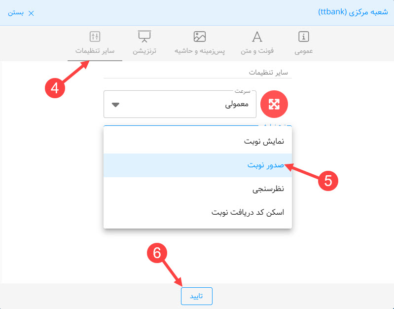 بعد از اضافه نمودن اینفوآیتم نوبتدهی مورد نظر، در پنل تنظیمات آن اینفوآیتم، در صفحهی سایر تنظیمات، نوع نمایش بر روی صدور نوبت تنظیم و ثبت گردد.
