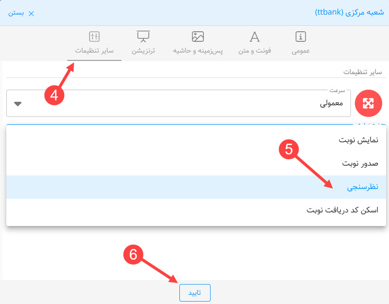بعد از اضافه نمودن اینفوآیتم نوبتدهی مورد نظر، در پنل تنظیمات آن اینفوآیتم، در صفحهی سایر تنظیمات، نوع نمایش بر روی نظرسنجی تنظیم و ثبت گردد.