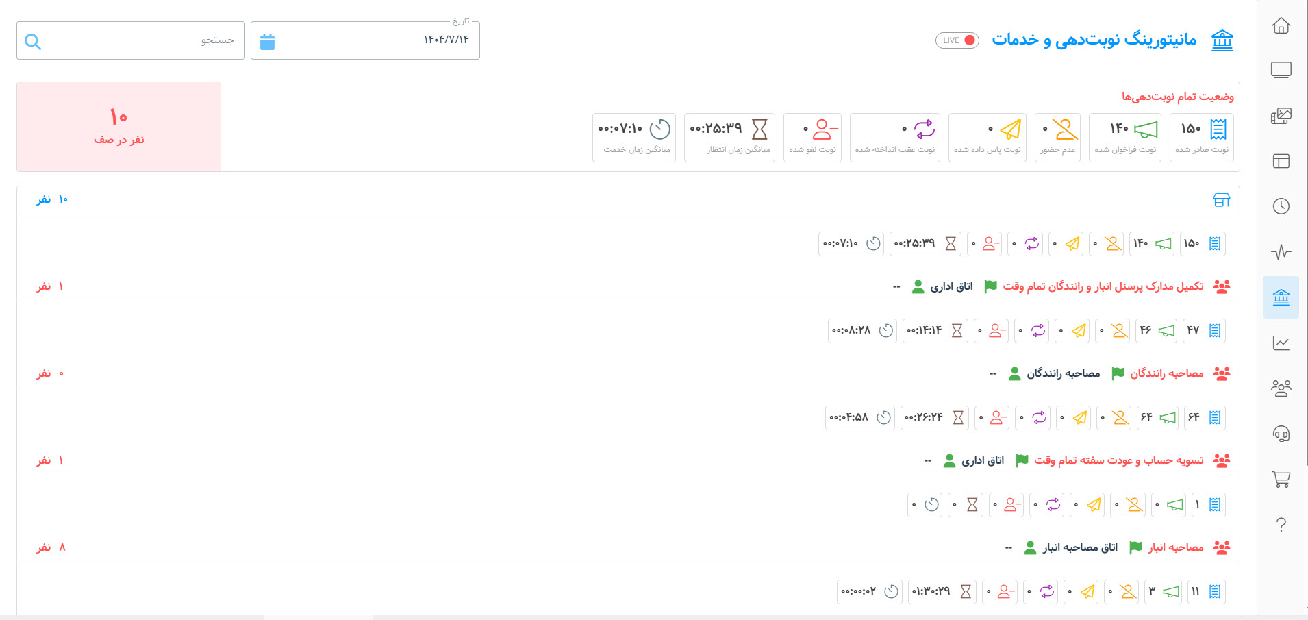 در این قسمت ما میتوانیم بصورت لحظهای اطلاعات مربوط به نوبت های صادر شده را مشاهده کنیم، اطلاعاتی از قبیل تعداد نوبت های صادر شده، تعداد نوبت های فراخوان شده،تعداد افرادی که پس از دریافت نوبت حضور نیافتهاند، تعداد نوبت های پاس داده شده ، تعداد نوبتهای عقب انداخته شده، تعداد نوبتهای لغو شده، میانگین زمان انتظار و میانگین زمان خدمت.