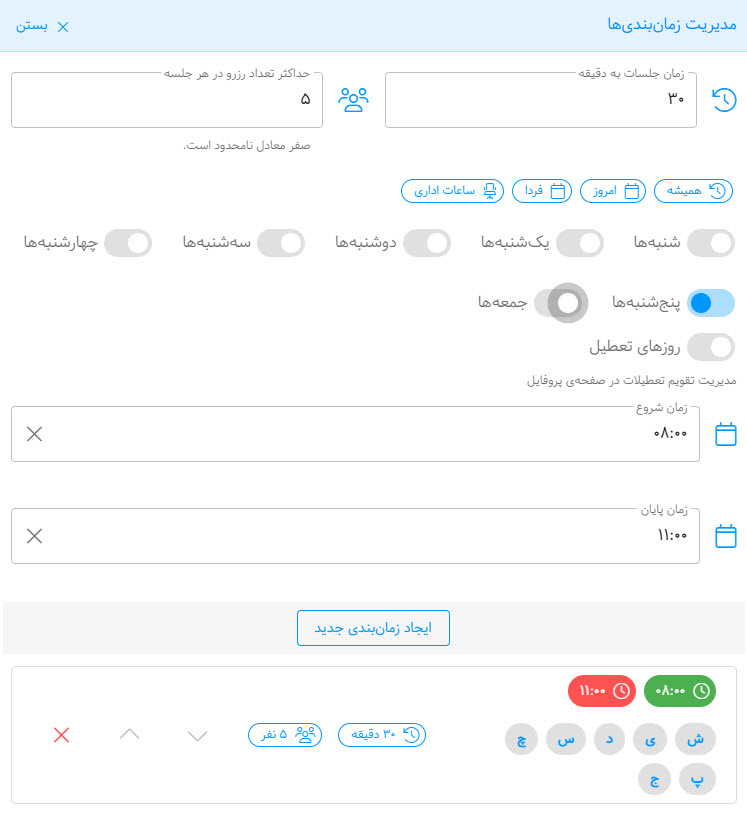 در پنل مدیریت زمانبندی میتوان به تعداد دلخواه بازه زمانی مجاز برای رزرو نوبت توسط مراجعین تعیین نمود. هر کدام از این بازههای زمانی از جلساتی تشکیل میگردند که هر جلسه ظرفیت رزرو مشخصی را دارد. مدت جلسات و تعداد رزرو مجاز در هر جلسه را نیز میتوان هنگام تعریف زمانبندی تعیین کرد.