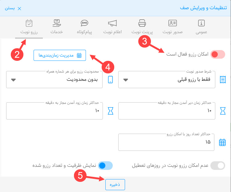 - فعال و غیرفعال کردن رزرو آنلاین نوبت و تنظیمات رزرو آنلاین