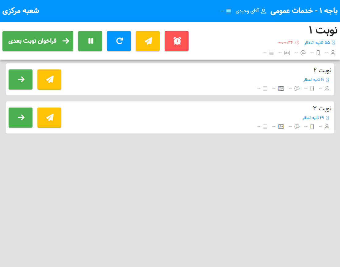 فراخوانی نوبت از طریق مرورگرهای سیستم و یا گوشی مسئولین باجهها بدون نیاز به دکمه فیزیکی
