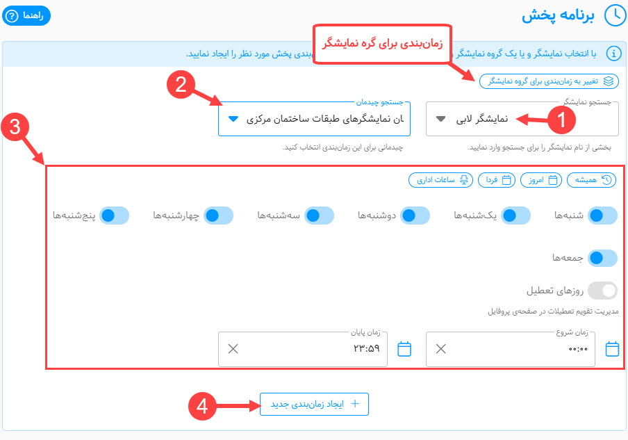 برای ایجاد زمانبندی جدید از طریق پنل زمانبندیها اقدام میشود. بدینصورتکه با انتخاب نام نمایشگر یا گروه نمایشگر و همچنین نام چیدمان مورد نظر و مشخص نمودن بازه زمانی دلخواه (بازهی زمانی که باید این نمایشگر یا گروه نمایشگر آن چیدمان را نمایش دهد) زمانبندی جدید را میتوان ایجاد نمود.