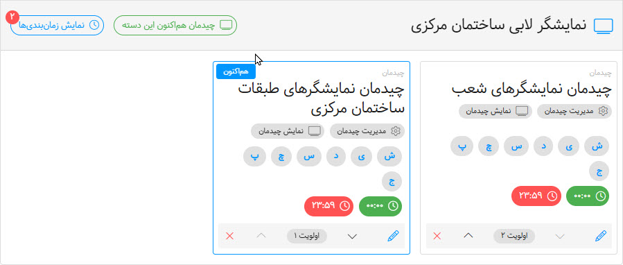 اگر نمایشگر یا گروه نمایشگر دارای دو یا چند زمانبندی با تلاقی زمانی باشد، در زمانهای تلاقی، اولویت با نمایشگری است که اولویت بالاتری دارد. تغییر اولیت زمانبندیها برای هر نمایشگر یا گروه نمایشگر در لیست زمانبندیها امکان پذیر است.