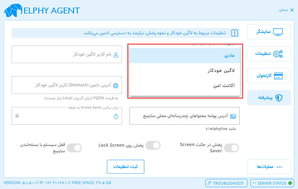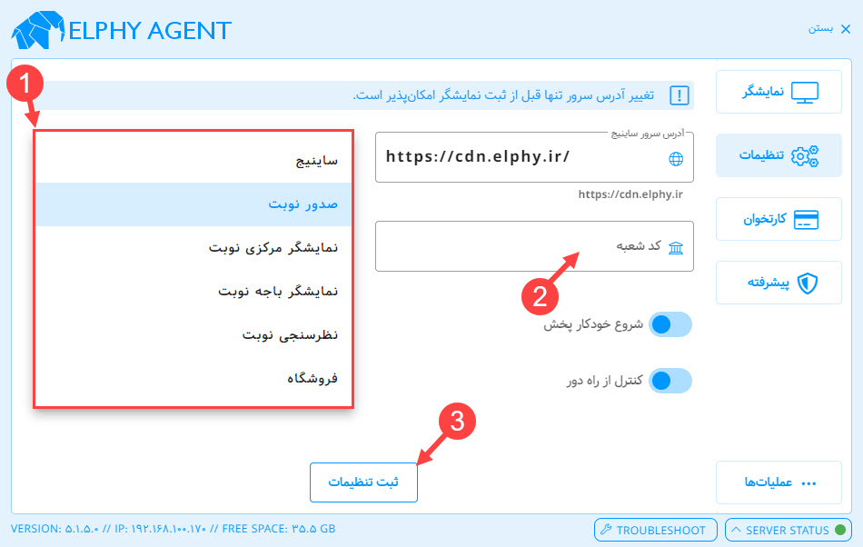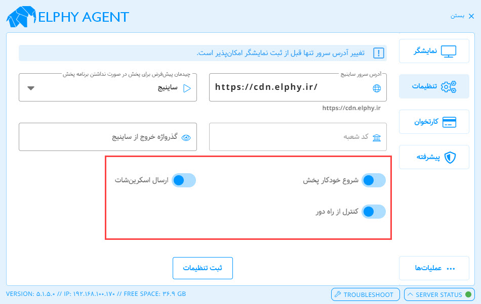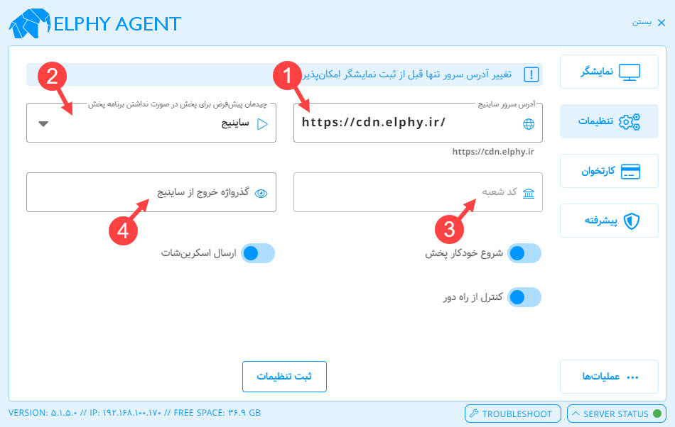 بخش تنظیمات در نرم افزار پخش کننده Elphy Agent برای مدیریت ارتباط با سرور و تنظیم رفتار پخش نمایشگر استفاده میشود. در ادامه، هر قسمت از این بخش توضیح داده شده است: