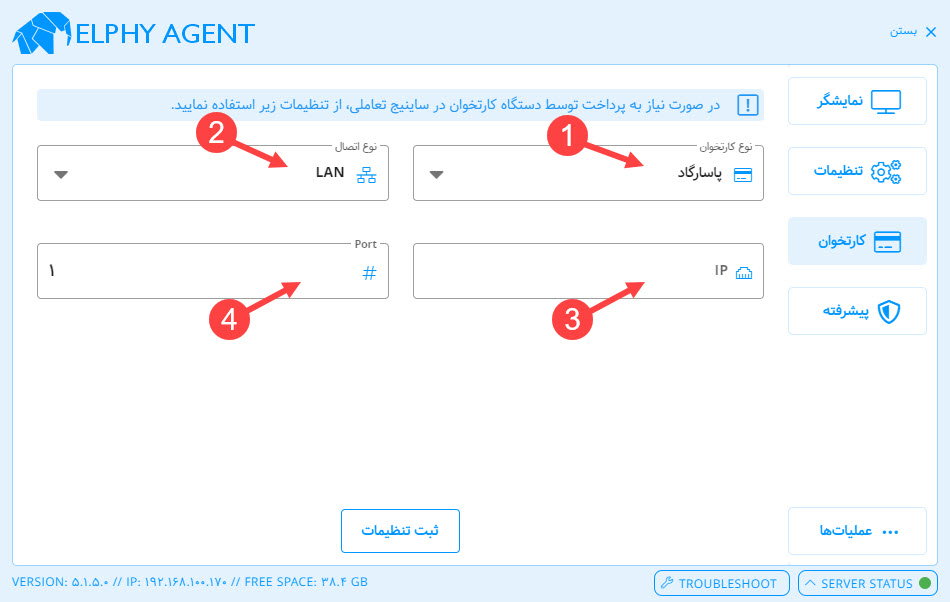 ۳-IP: در صورت انتخاب حالت LAN، باید آدرس IP دستگاه کارتخوان در این قسمت وارد شود. این IP باید در همان شبکه محلی که Elphy Agent نصب شده است، قابل دسترسی باشد.