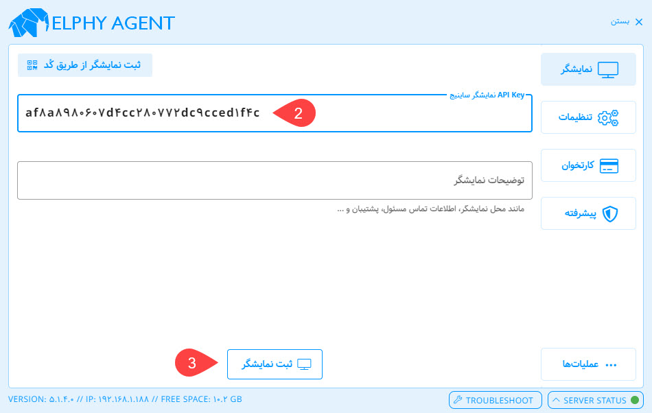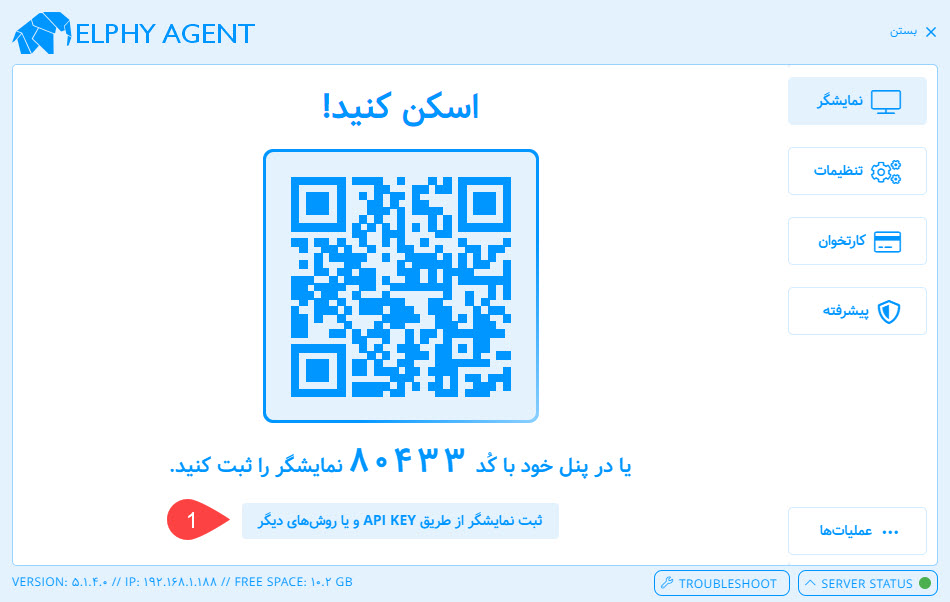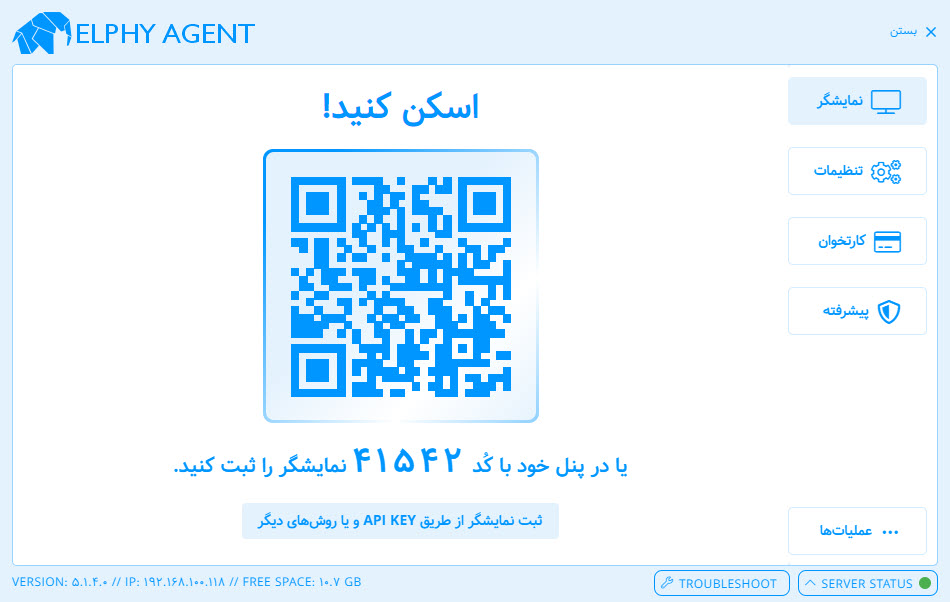 امکان تعریف نمایشگر توسط Elphy Agent برای مشتریانی که تعداد نمایشگر زیادی دارند مناسب است. در غیر این صورت ثبت با کد و یا api key توصیه می گردد.