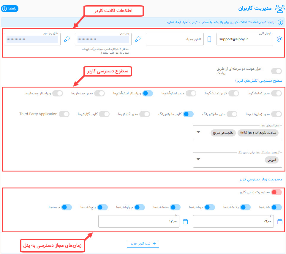 در صورت نیاز و برای افزایش امنیت میتوان هنگام تعریف کاربر، روزها و زمانهای مجاز دسترسی به سامانه را نیز ثبت نمود. بدین معنی که کاربر خارج از زمانهای تعیین شده، اجازه دسترسی به سامانه مدیریت ساینیج را نخواهد داشت.